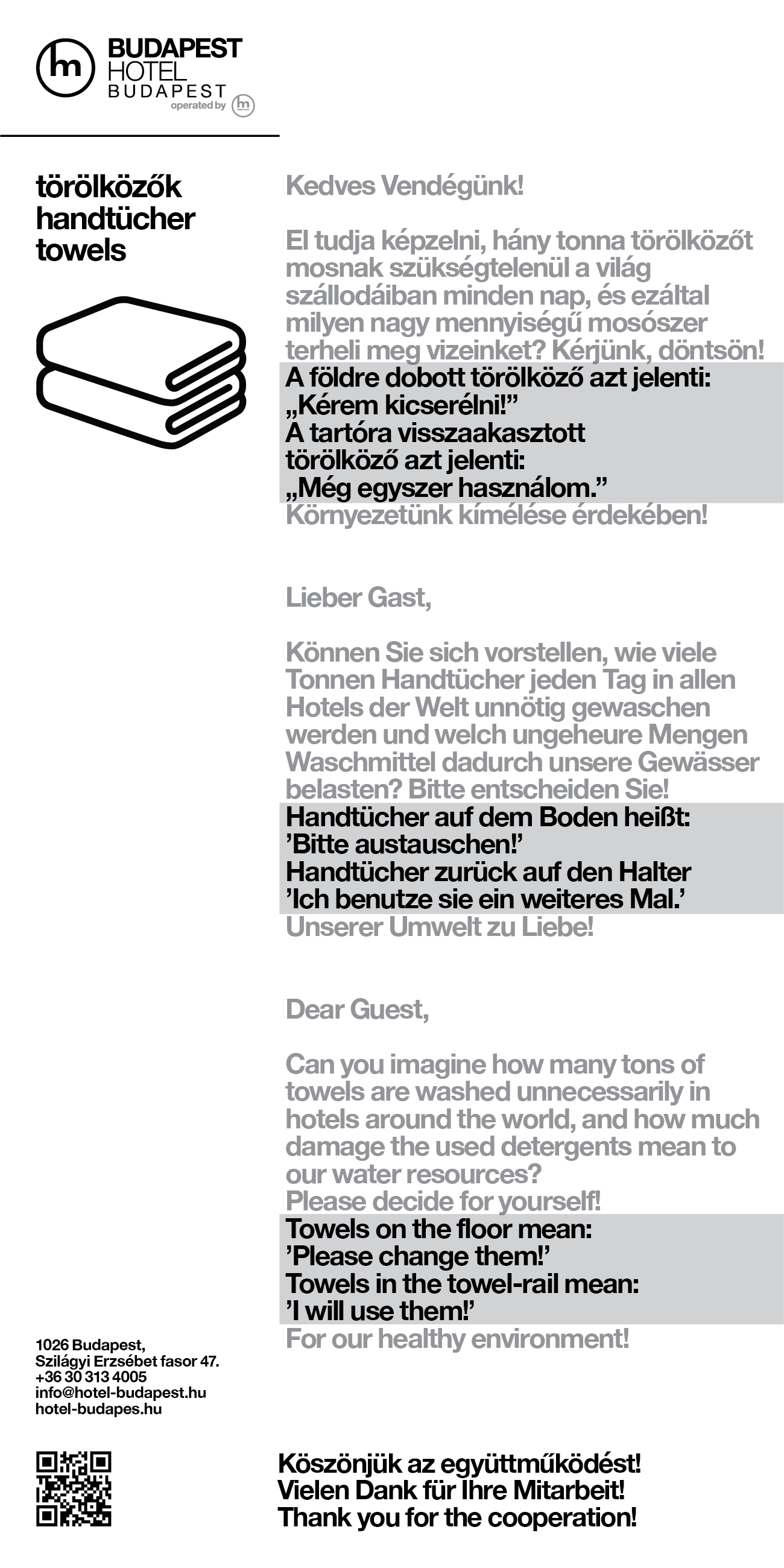 Kedves Vendégünk! El tudja képzelni, hány tonna törölközőt mosnak szükségtelenül a világ szállodáiban minden nap, és ezáltal milyen nagy mennyiségű mosószer terheli meg vizeinket?